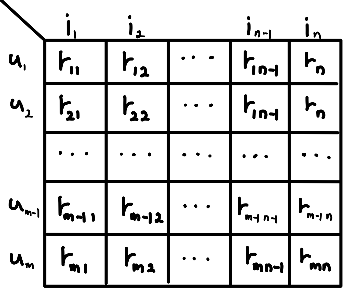 M 명의 User와 N개의 Item으로 구성된 상황에서 Rating Matrix R의 element인 $(r_{ui})$는 User u의 Item i에 대한 평가를 나타낸다