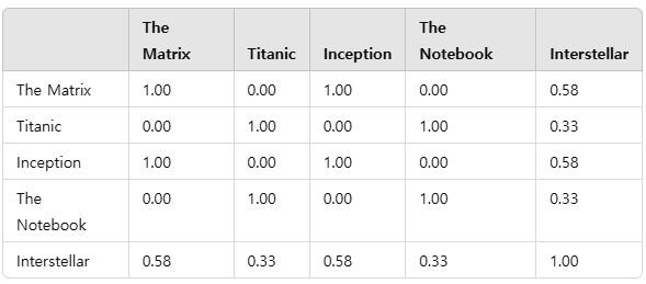 벡터화 된 Rating Matrix를 기반으로 계산한 Cosine Similarity입니다