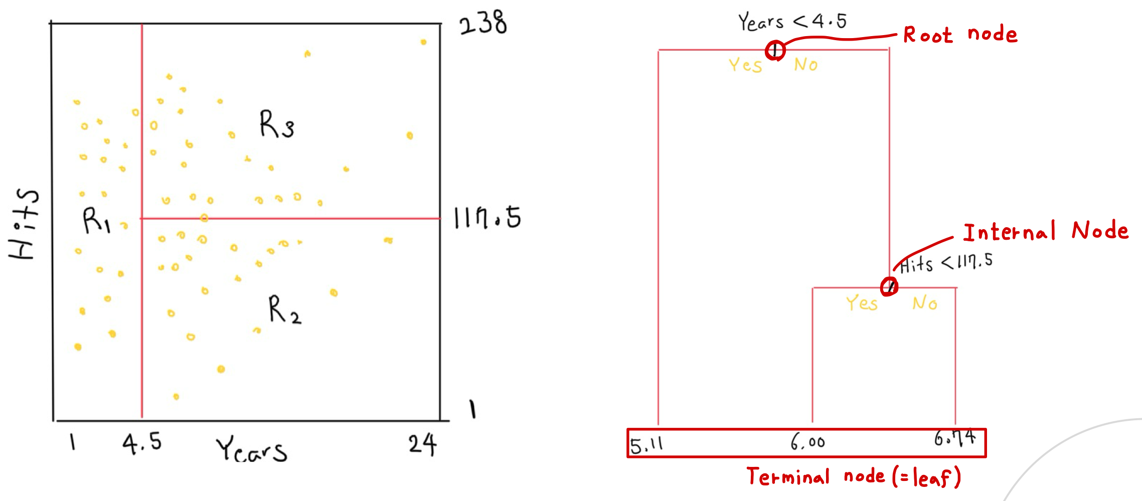 아래의 그림에서 "Years <4.5" 라는 의사결정규칙에 따라 $R_1$이 분류되고 그 후 "Hits < 117.5" 라는 규칙에 의해 $R_2, R_3$로 분류됩니다