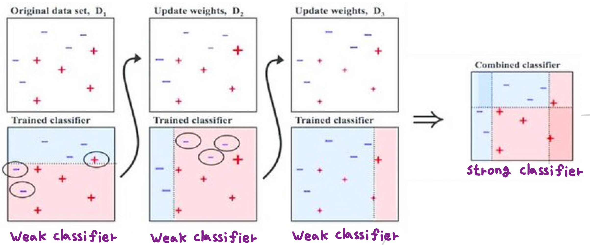 Boosting이란 여러 개의 Weak Classifier(약분류기)를 순차적으로 학습하며, 앞에서 학습한 분류기에서 예측이 틀린 샘플에 대해 다음 분류기가 가중치를 인가하여 학습을 이어 진행하는 방식입니다