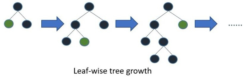 Node의 split을 균형 트리 분할(Level - wise Tree Growth) 방식이 아니라 최대 Loss를 가진 Node를 중심으로 계속 분할하는 Leaf 중심 트리 분할 (Leaf-wise Tree Growth)방식을 사용합니다