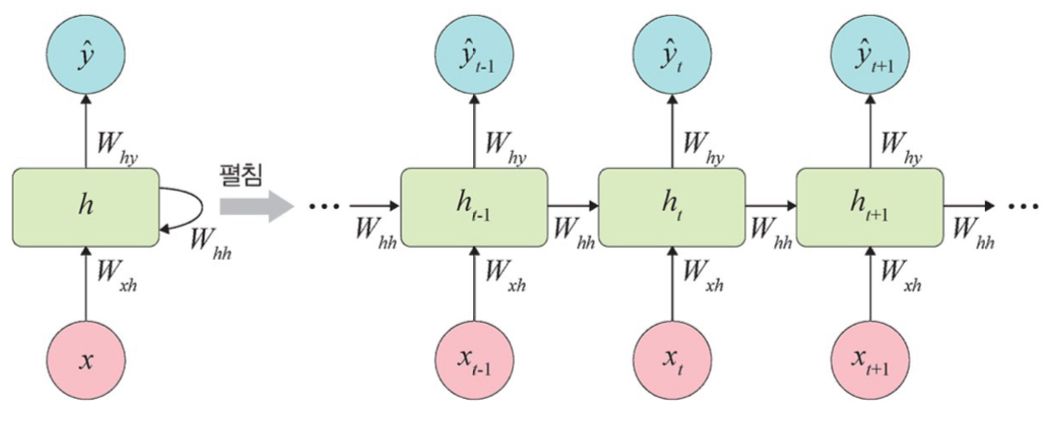 - ${\large W_{hh}}$ : t 시점의 은닉층에서 t + 1 시점의 은닉층으로 전달되는 가중치