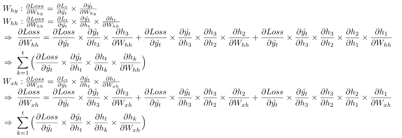 - \begin{aligned} h_t &= \tanh{(W_{xh}\cdot x_t + W_{hh} \cdot h_{t-1})}\\ &= \tanh{(W_{xh} \cdot x_t + W_{hh} \cdot \tanh{(W_{xh} \cdot x_{t-1} + W_{hh} \cdot h_{t-2})})} \end{aligned}