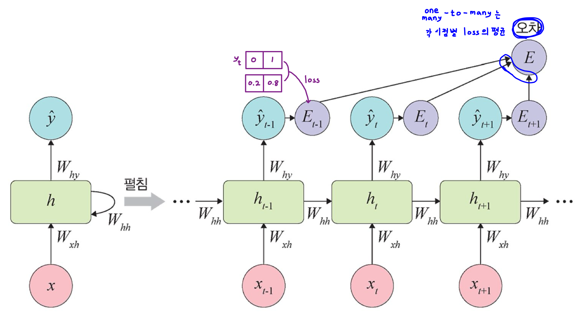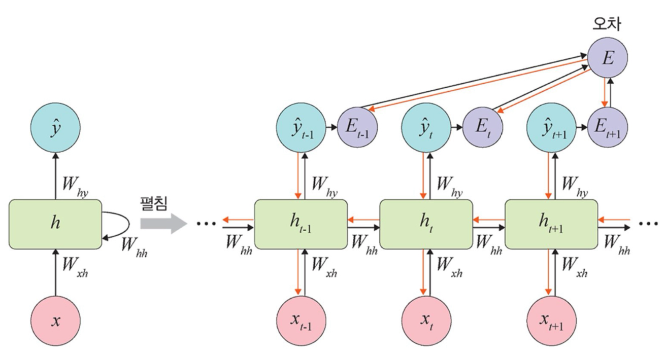 RNN의 오차(E)는 심층 신경망에서 전방향 학습과 달리 각 단계(t)마다 오차를 측정한다