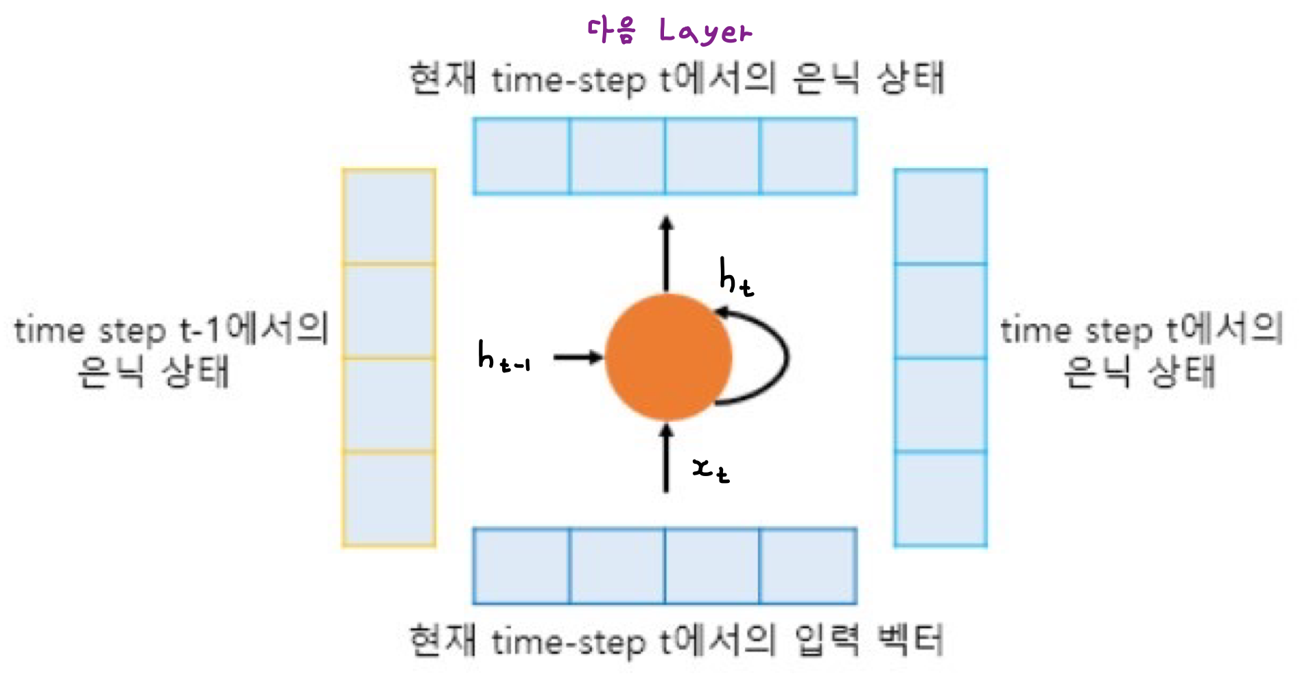 이때 t에서의 Hidden State는 바로 위에 또 다른 은닉층이나 출력층이 존재할 경우 위의 Layer로 보내거나, 필요없으면 값을 무시할 수 있다.