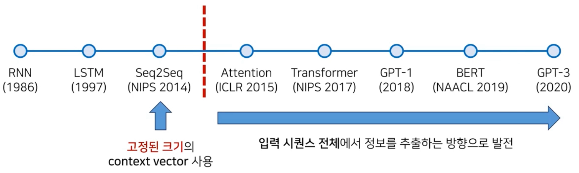 Seq2Seq 모델은 이후에 살펴보겠지만 Input Sequence를 고정된 크기의 Context Vector로 Encoding하여 Output sequence를 생성하는 방식이다. 하지만 고정된 크기의 Context Vector로 인해 긴 문장을 처리할 때 한계를 보이기 때문에 Attention Mechaism을 사용한 모델들로 발전되었다.