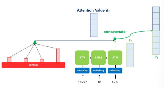 구한 Attention Value $a_t$와 $s_t$를 결합(concatenate)하여 하나의 벡터로 만든다. 이 벡터를 $v_t$라고 하자