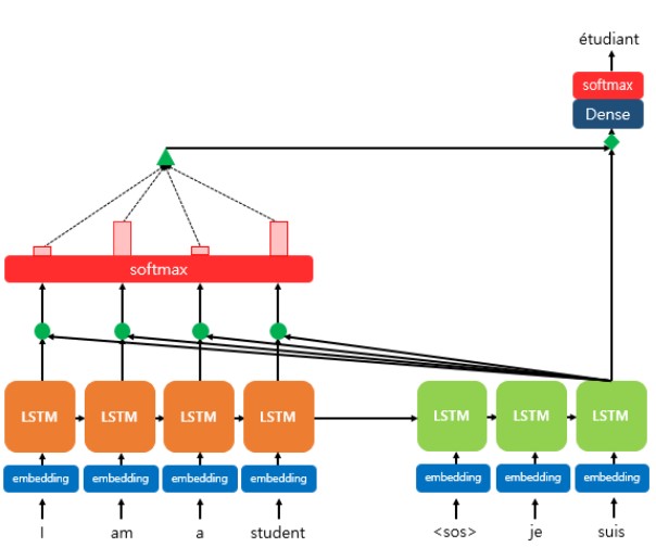 위 그림에서 Decoder의 세번째 LSTM Cell에서 출력 단어를 예측할 때, Attention 메커니즘을 이용하는 모습을 보여준다.