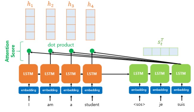 Dot Product Attention은 Score 값을 구하기 위해 $s_t$의 Transpose ${s_t}^T$와 Encoder의 각 Hidden State $h_i$와 Dot Product를 수행한다.(결과가 스칼라값)