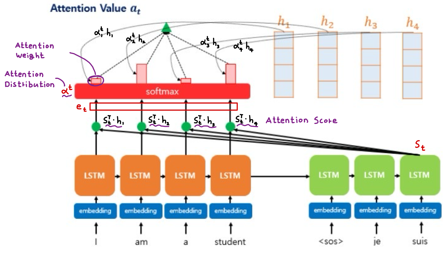 Decoder의 첫번째, 두번째 LSTM Cell은 이미 Attention 메커니즘을 통해 je, suis를 예측하는 과정을 거쳤다고 가정한다. Decoder의 세번째 LSTM Cell은 출력 단어를 예측하기 위해 Encoder의 모든 입력 단어 정보를 다시 한번 참고하고자 한다. 여기서 Encoder의 Output에 Softmax를 적용하여 "I", "am", "a", "student" 단어 각각이 Decoder의 세번째 출력 단어를 예측할 때 얼마나 도움이 되는지를 수치화한다.