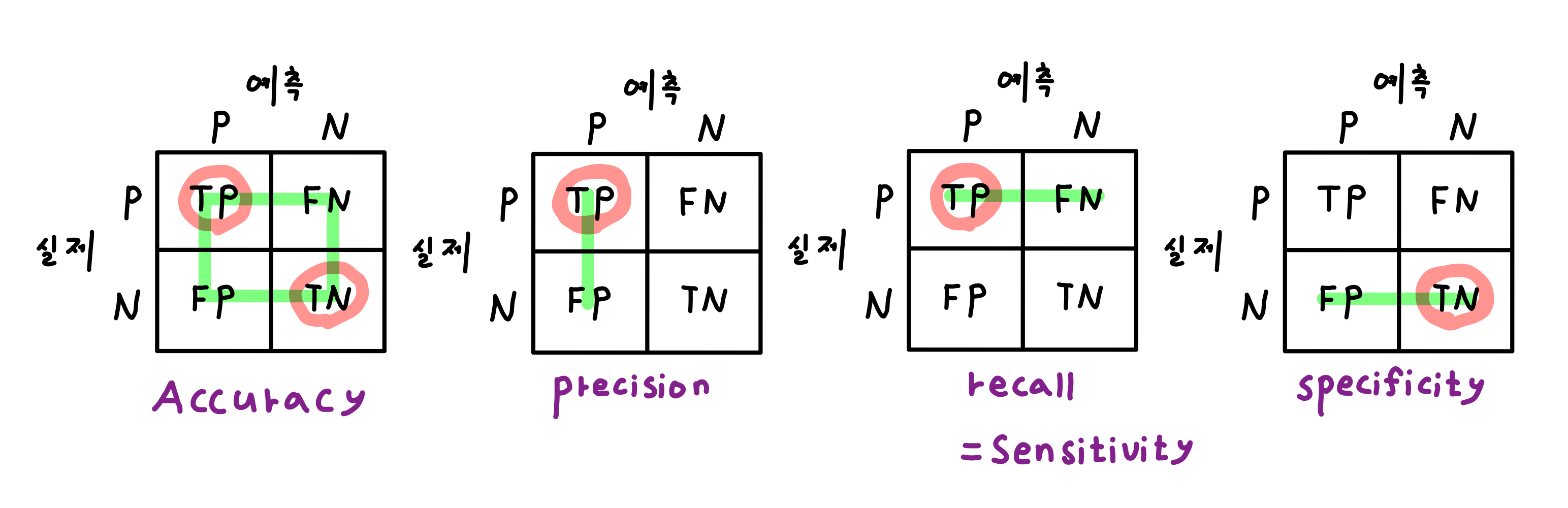 아래 그림은 Accuracy, Precision, Recall(Sensitivity), Specificity를 알아보기 쉽게 그린 그림이다