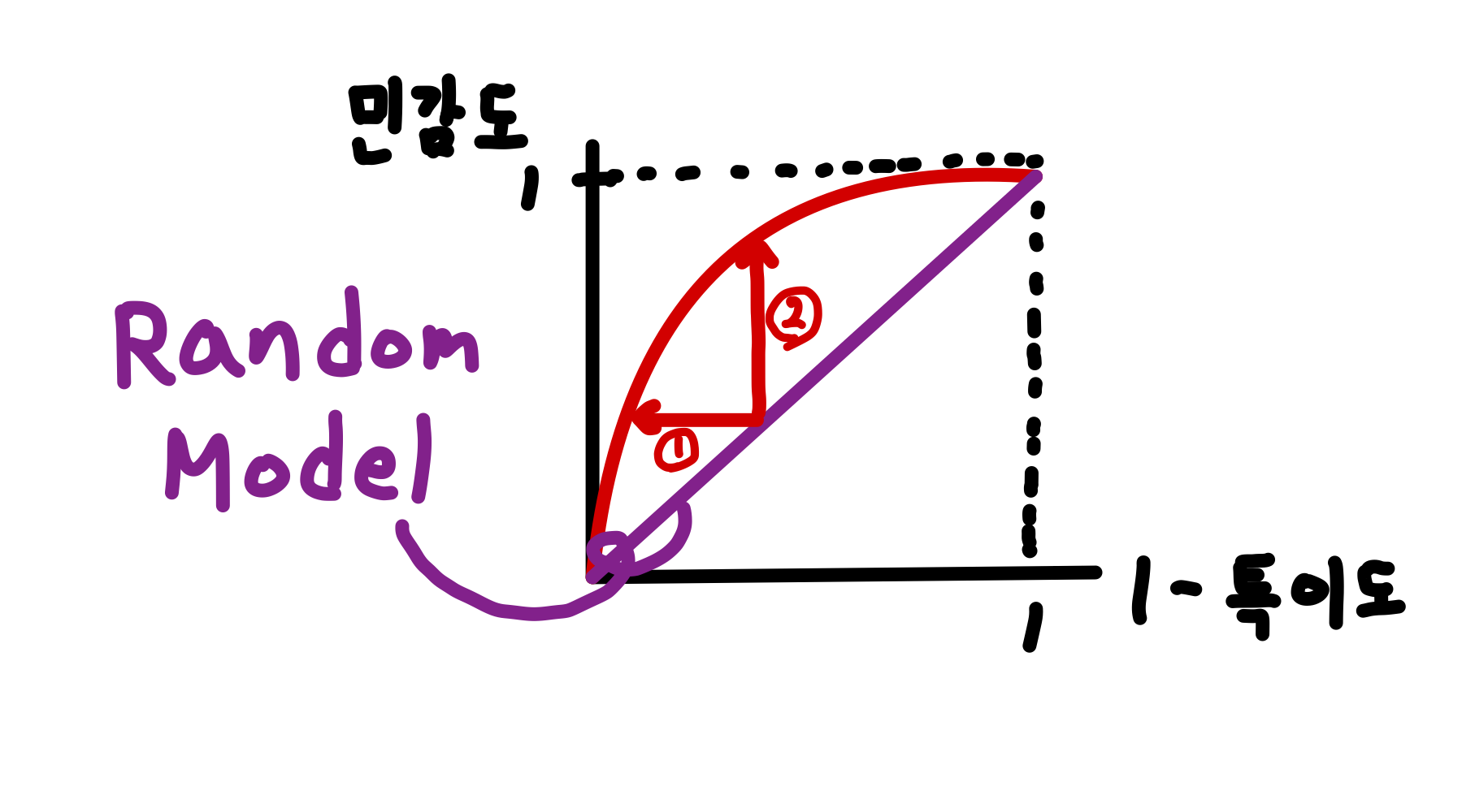 FPR(False Positive Rate)(=1 - Specificity) : 실제 값이 Negative 인 것 중 모델이 Positive로 잘못 예측한 비율