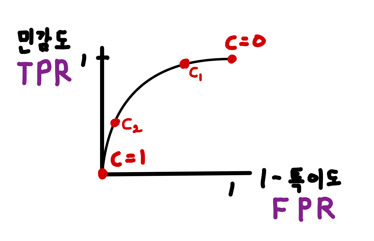 즉, Threshold c를 낮추면 TPR이 커지고 동시에 FPR로 커지는 관계라 할 수 있다