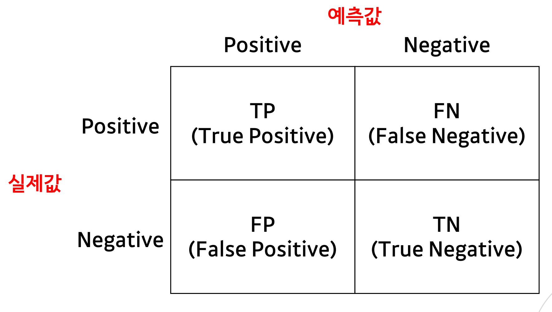TN : 실제값이 Negative(0)이고 모델의 예측값도 Negative(0)