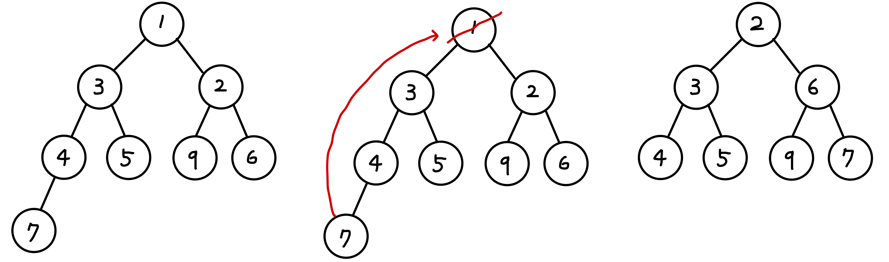 추가할 Item인 7를 추가하고, Root인 1을 제거한 후 Min Heap에 맞게 다시 조정합니다.