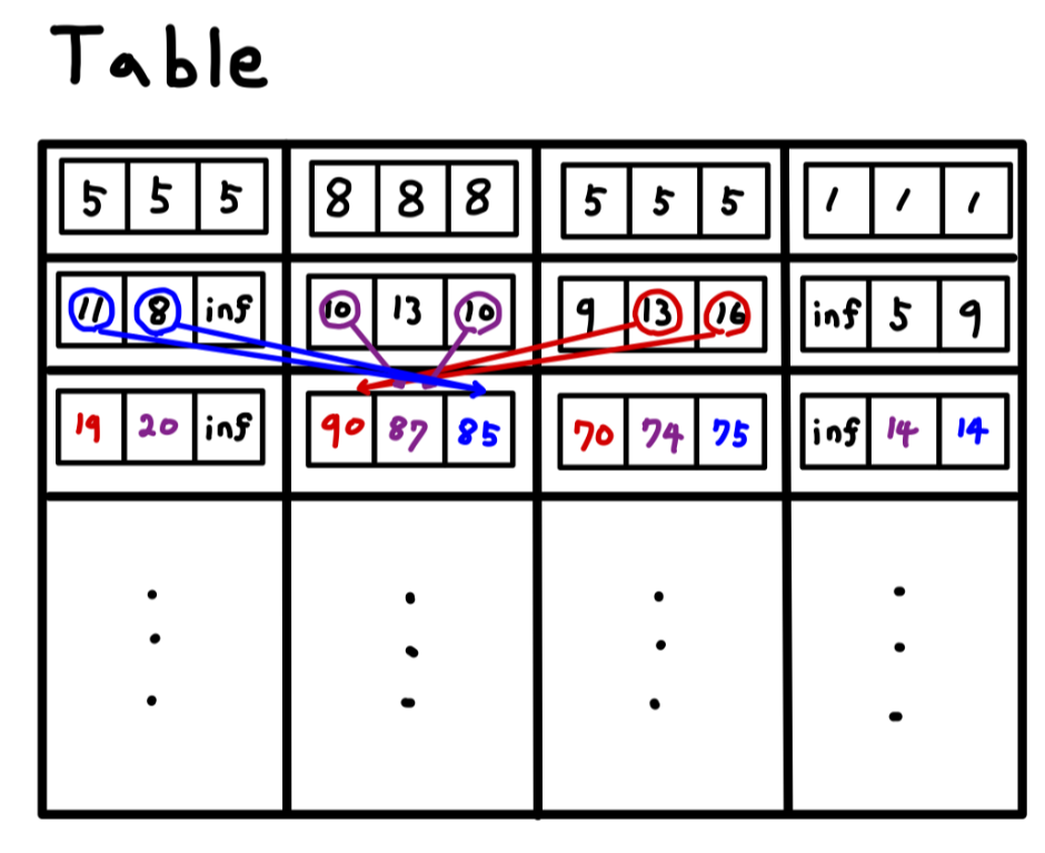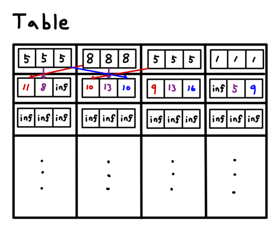파란색 선 : dp[2][1][2] = min(dp[1][0][0], dp[1][0][1]) + matrix[2][1] = min(11, 8) + 77 = 85
