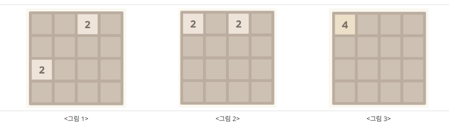 <그림 1>의 경우에서 위로 블록을 이동시키면 <그림 2>의 상태가 된다. 여기서, 왼쪽으로 블록을 이동시키면 <그림 3>의 상태가 된다.