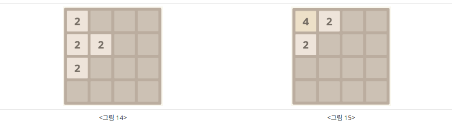 마지막으로, 똑같은 수가 세 개가 있는 경우에는 이동하려고 하는 쪽의 칸이 먼저 합쳐진다. 예를 들어, 위로 이동시키는 경우에는 위쪽에 있는 블록이 먼저 합쳐지게 된다. <그림 14>의 경우에 위로 이동하면 <그림 15>를 만든다.