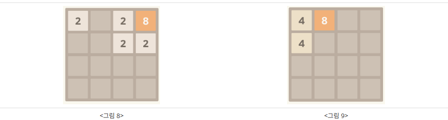 <그림 8>의 상태에서 왼쪽으로 블록을 옮기면 어떻게 될까? 2가 충돌하기 때문에, 4로 합쳐지게 되고 <그림 9>의 상태가 된다.