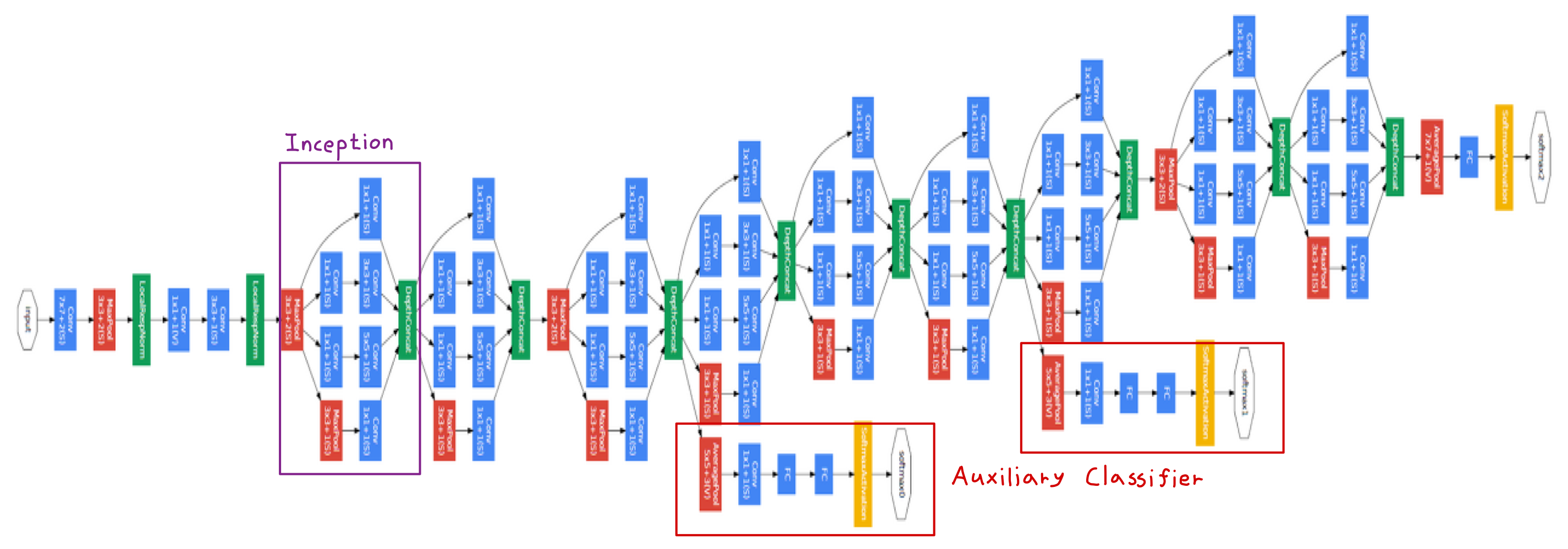 GoogLeNet은 Auxiliary Classifier라는 중간 분류기를 도입하여, Network의 학습을 돕습니다.